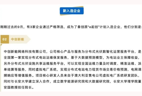 2023年(nián)10月(yuè)7日(rì),秦創原“e起創”計(jì)劃入選企業(yè)名單正式公布,中創新能(néng)網絡科(kē)技(j≥ì)有(yǒu)限責任公司(以下(xià)簡稱“中創新能(néng)”)通(tōng)過嚴格篩選,成功跻身(shēn)榜單之列。